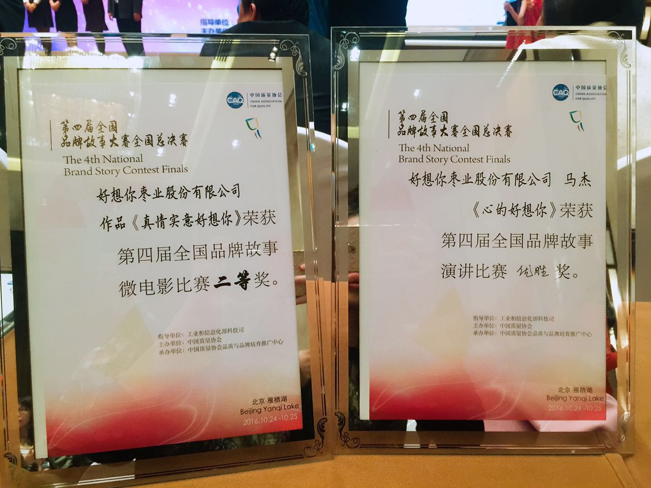 日前,中國質量協會傳來捷報,在第四屆全國品牌故事大賽中,好想你棗業選送的品牌故事影片《真情實意好想你》(公司形象宣傳片)榮獲微電影比賽單元二等獎;好想你營銷管理中心馬杰演講的《心的好想你》獲得演講比賽單元優勝獎。