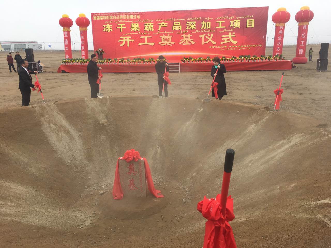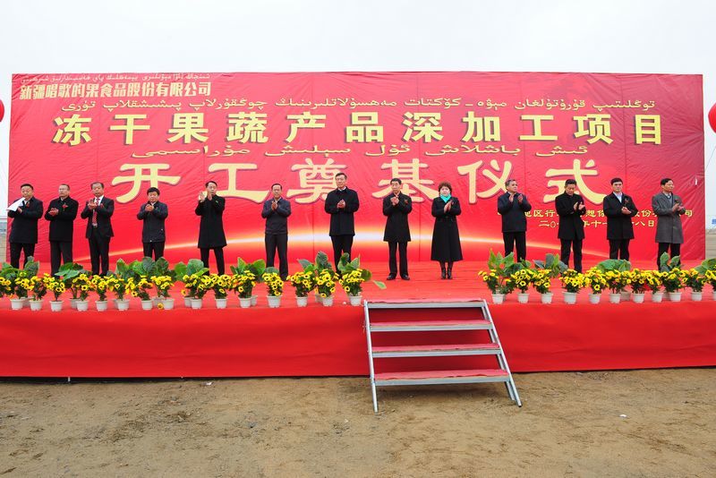 11月18日上午,好想你投資1.5億元建設(shè)凍干果蔬產(chǎn)品深加工項目——新疆唱歌的果食品股份有限公司開工奠基儀式在新疆維吾爾自治區(qū)哈密高新技術(shù)產(chǎn)業(yè)開發(fā)區(qū)北部新興產(chǎn)業(yè)園舉行,新疆維吾爾自治區(qū)政協(xié)黨組副書記、常務副主席白志杰、河南省副省長王鐵、地區(qū)行署專員祖穆熱提·吾布力等領(lǐng)導參加奠基儀式。