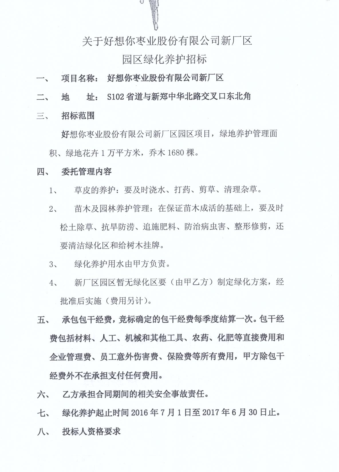 關于好想你棗業(yè)股份有限公司新廠區(qū)園區(qū)綠化養(yǎng)護招標