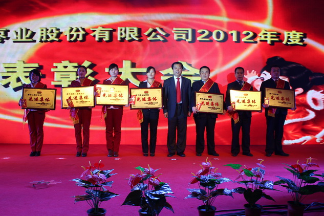 在頒獎典禮上,董事長石聚彬為公司2012年度7個先進集體和石紅偉、張丙軍兩名年度感動人物頒獎,公司副總級高管分別為銷售二部總監湛明乾等8名年度感動人物、行政中心企管部王凌燕等年度勞動模范、董事會辦公室朱菲菲等年度先進個人頒獎。