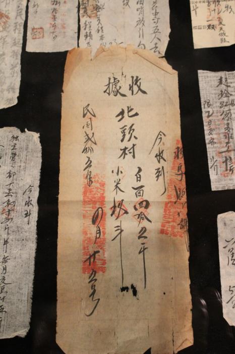 在新鄭市紅色棗園革命文物珍藏館里,墻壁上掛滿了延安革命時(shí)期、抗日戰(zhàn)爭時(shí)期、解放戰(zhàn)爭時(shí)期的革命文物,包括入黨志愿書、黨章及其學(xué)習(xí)輔導(dǎo)材料,軍民借條借據(jù),百姓為子弟兵送軍鞋的收條,出公差的收據(jù),裝棗的慰問袋,以及八路軍為根據(jù)地百姓調(diào)解矛盾糾紛的資料等,在玻璃櫥窗內(nèi)還放著一些革命文物,每一件的背后都蘊(yùn)藏著一段革命故事,整個(gè)革命珍藏館的文物數(shù)量可達(dá)1萬多份。