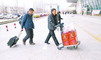 劉書顯推著他的年貨準備坐飛機回家,記者跟在后面。