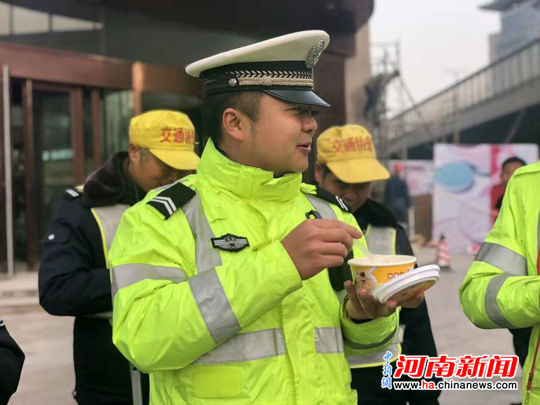 在著名的鄭州市花園路農業路楊華民崗,好想你工作人員為正在那里執勤的交警每人送上一碗熱騰騰的清菲菲。喝著暖暖的湯,很多交警打開了話匣子。一名年輕的交警表示,他們不怕在寒風中一站一天,也不怕霧霾天氣、汽車尾氣的危害,就怕人們不理解他們。他剛喝了一口湯,就趕緊上前攔下要闖紅燈的電動車,提醒他等綠燈亮了再通行。