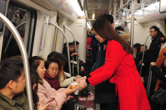 在黃河南路地鐵站內,有乘客進入車廂后驚喜地發現,紅衣天使正在派發清菲菲紅棗湘蓮銀耳湯。“今日臘八,請您喝碗不一樣的臘八粥”,紅衣天使一邊派發一邊說:“好想你清菲菲祝您臘八快樂!”