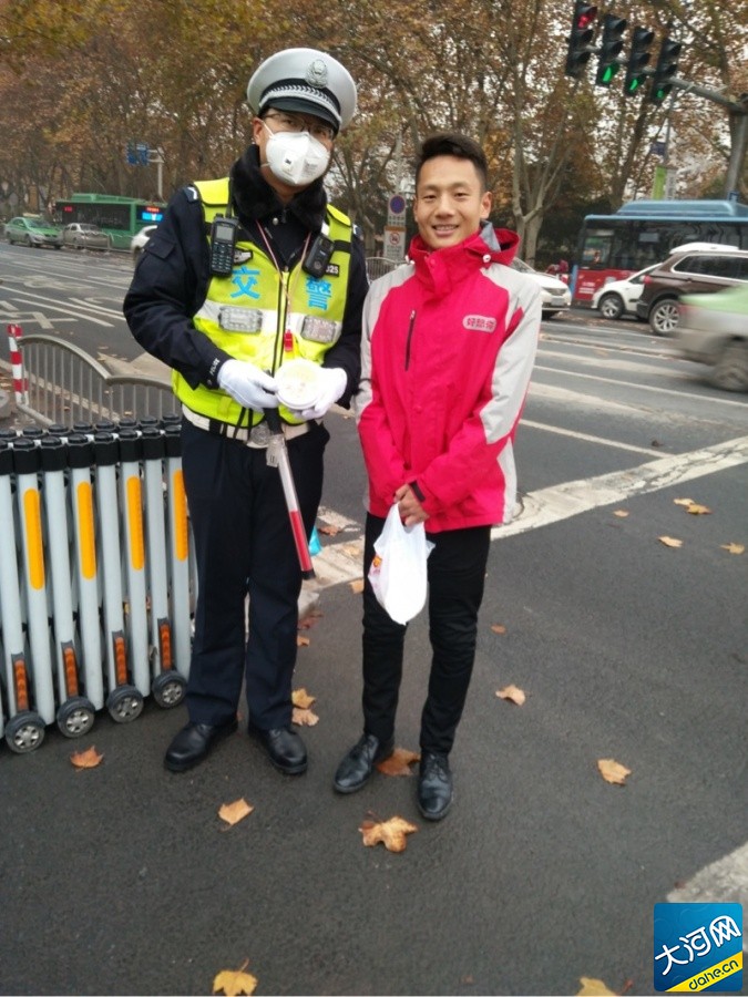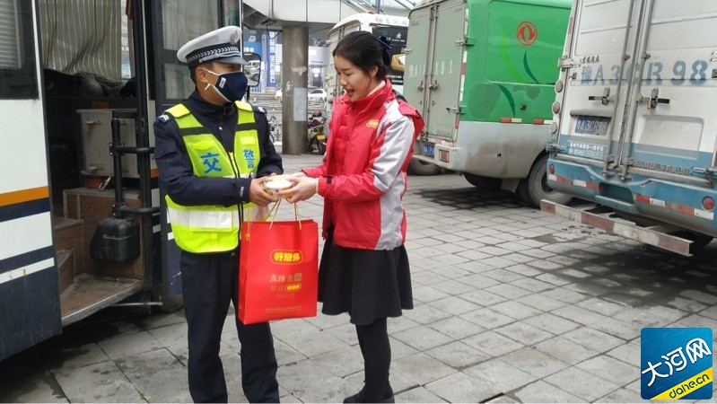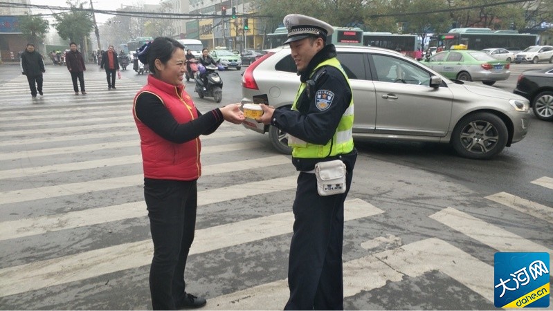 早上8點起,在鄭州東大街紫荊山、航海路大學路、嵩山路淮河路、華山路中原路等路段,好想你的愛心使者走上街頭,將剛剛用熱水沖泡好的清菲菲紅棗湘蓮銀耳湯送給執勤交警。