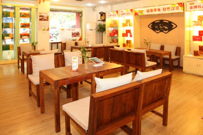 好想你鄭州農業路店店長趙媛見顧客挑選完商品,就把他們引到休閑區休息。休閑區擺放著四張桌子,八把木椅,椅子上擺著很講究的坐墊和靠枕,椅背上篆刻著好想你的LOGO。趙媛說,這個區域原本是店里收銀臺的位置,店面升級后,就改造為顧客休閑區。跟收銀臺同樣命運的還有原先擺在店中央的貨架,壓縮后留給顧客更多選購、休閑的空間。